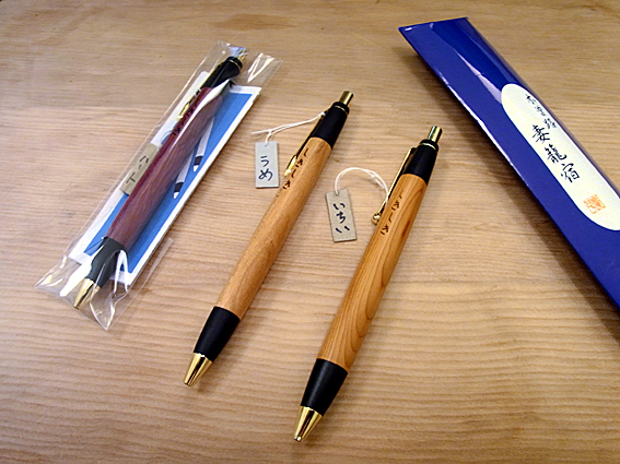 無垢材を使って作られたボールペンです。(当店の名入りです!)