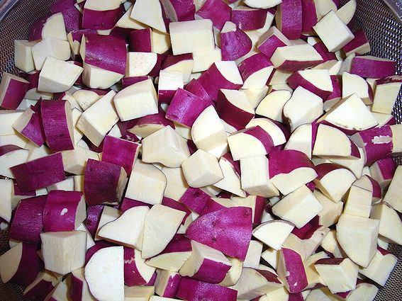 薩摩芋をサイコロ状に切り、流水にさらしてアク抜きします。