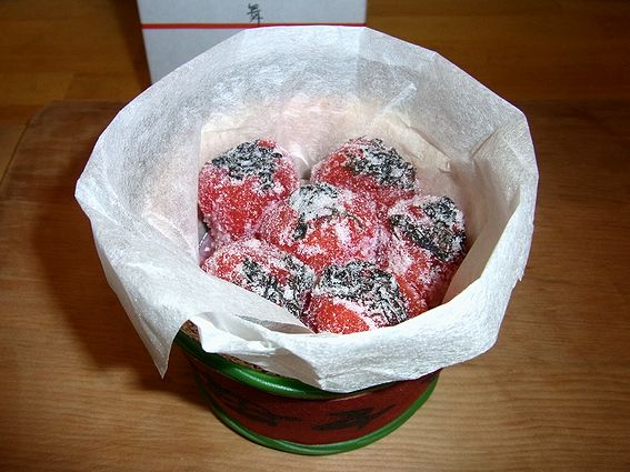 木樽を開けると梅干しそっくりな和菓子が現れます。