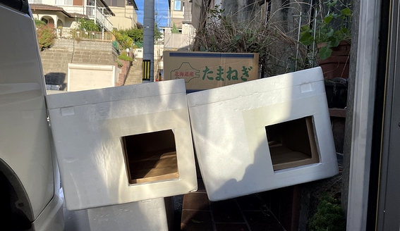これから寒くなりますので、発泡スチロールとダンボール箱を合わせて防寒対策です。