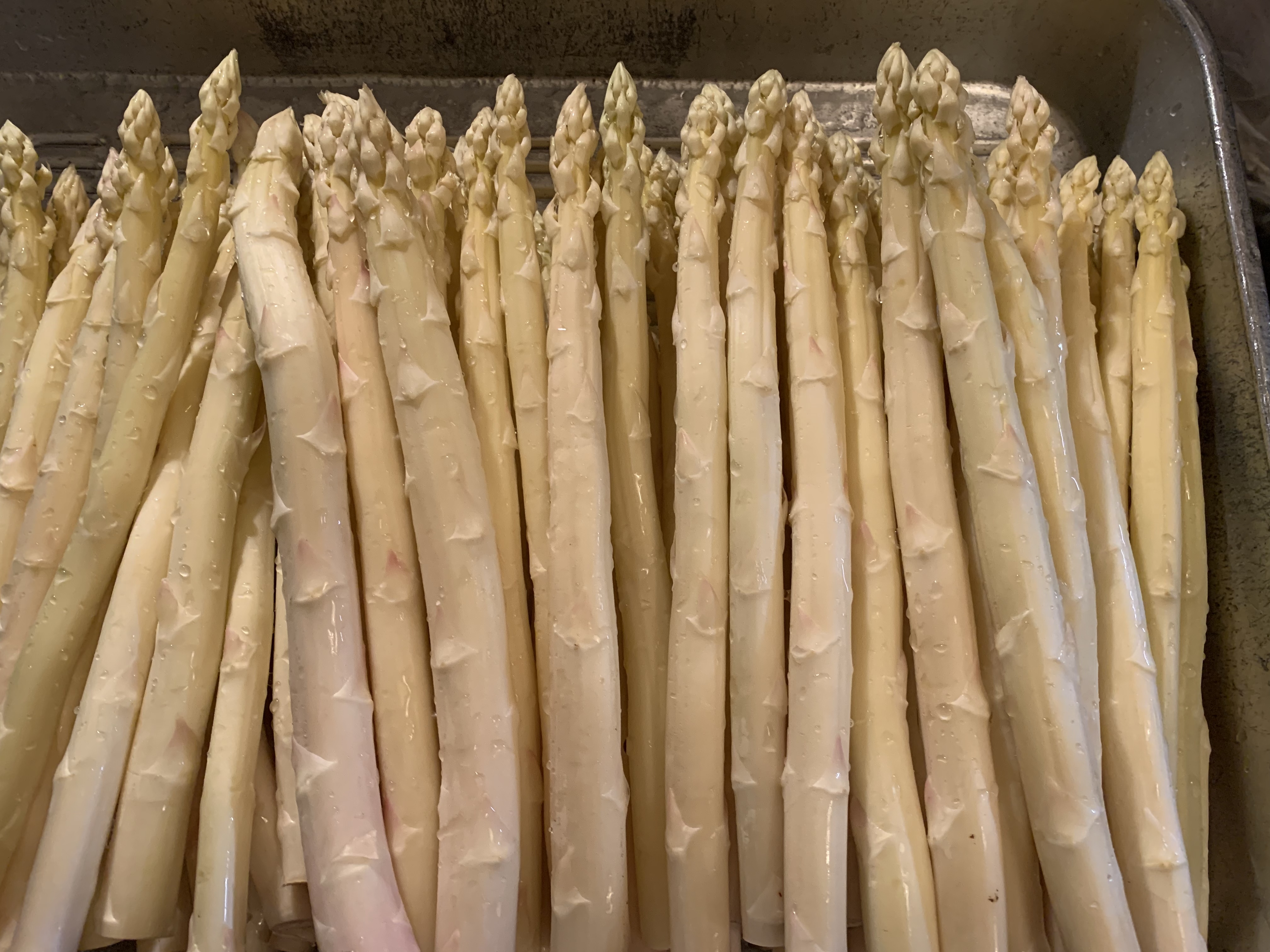 水煮のパックや缶詰のイメージがあるホワイトアスパラですが、時期に出回るフレッシュな物は独特の甘味と旨味、歯ごたえがあり大変瑞々しいものです。