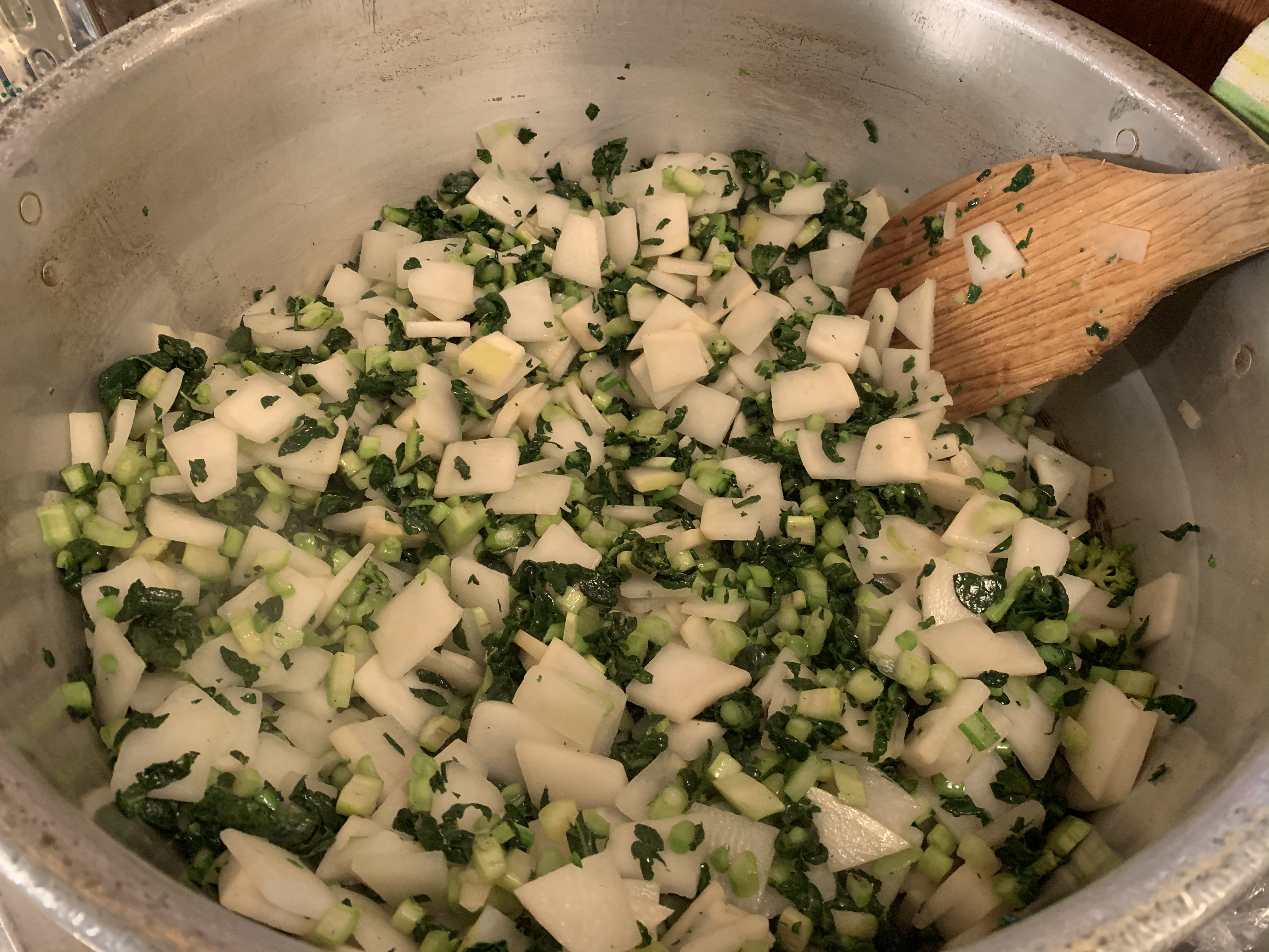 黄金出汁に大根を入れ、炊飯したら完成です。