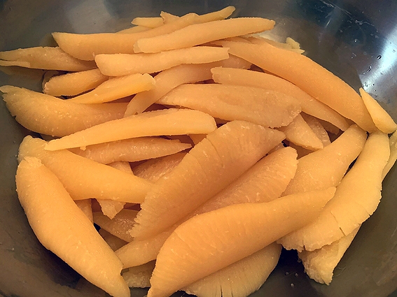 粗塩でこすり洗いし、煮汁が染みやすくします。