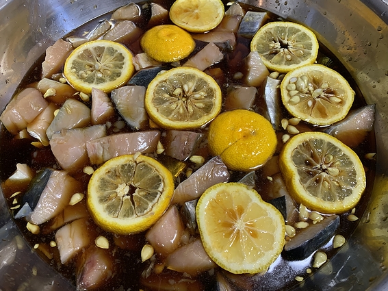 番茶で5時間ほど下茹でし、生臭みを抜いて骨まで柔らかくします。