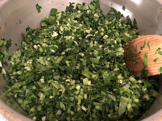 葉はざく切りにし、実は四角の薄切りにします。