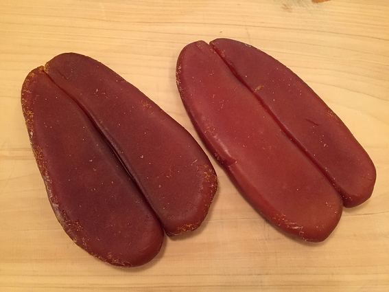 カラスミとは日本三大珍味で、鯔(ボラ)の卵巣に塩をして干した高級珍味です。