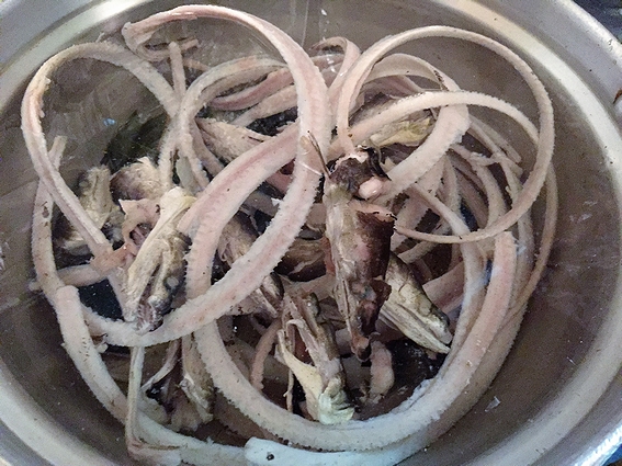 頭と骨は塩をした後に霜降りし、真昆布と共に水から茹でて出汁をとります。
