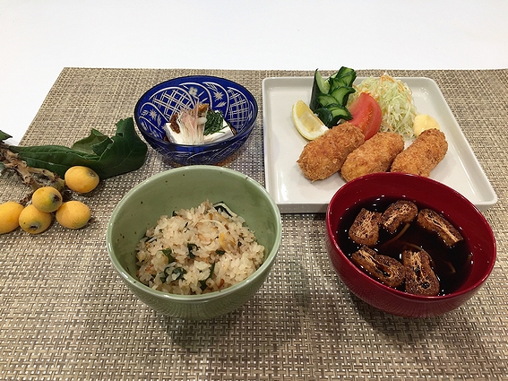 そこに茎ワサビの香りをきかせて炊き込みご飯にいたします。