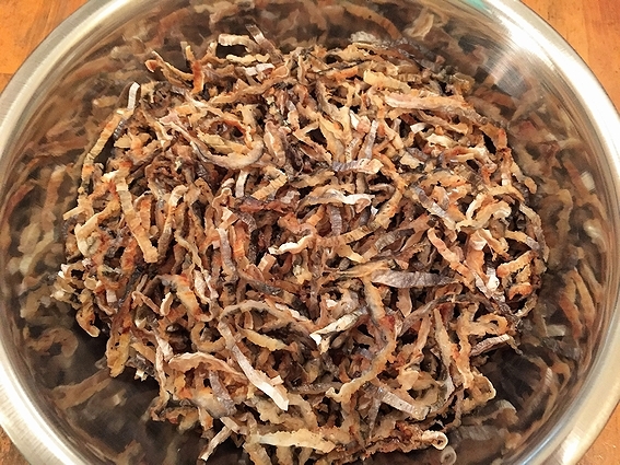 これを黄金出汁で炊き込んだご飯にまぶして作ります。