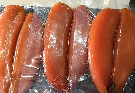 鯔(ボラ)の卵巣に塩をして天日で干した日本三大珍味のひとつ。
