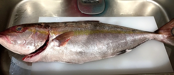 何軒か回り、偶然見つけた大きな間八(カンパチ)。