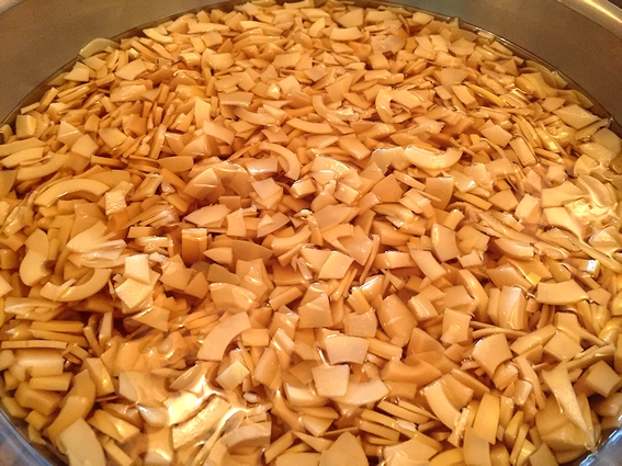 黄金出汁に油揚げ、ハチクを入れて炊飯します。