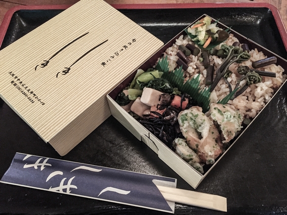 炊けたら少し蒸らし、ざっくりと混ぜてワラビのお浸しをパラッと乗せれば出来上がりです。