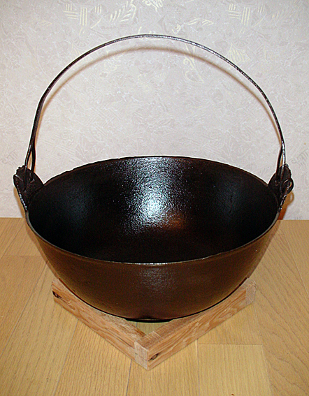 当店は毎年1734年創業の篠山市の小田垣商店さんの新豆を使用。御店には飛切極上という一年寝かせたヒネ豆もあるのですが、私は新豆が好みです。納屋から引っ張り出してきた鉄鍋を使用。これで煮ると黒々と煮上がります。米の研ぎ汁で丸一日戻し、コトコトコトコト三昼夜。昨今は手っ取り早く圧力鍋で煮る方も多いのですが、時間が美味しくしてくれます。最後は砂糖と醤油で味付けし、当店独特の黒豆になります。この濃厚なコクと香りの為に手間暇は惜しみません!また、当店は乾燥しないよう瓶詰めでお付けしています。