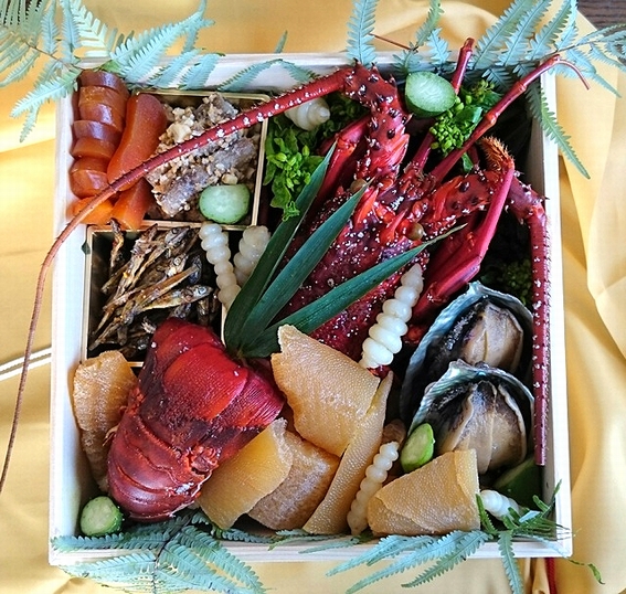 今年は伊勢海老が買えました。但し年末の伊勢海老は超高級品で場所も取る為三段重のみになります。鉋屑の中に入れられ活けで入荷。サイズはやや大きく重箱に入るかな?と思いましたが斜めにして何とか収まりました。身をブツ切りにし、頭の味噌を煮溶かし、酒で伸ばして西京味噌で仕上げました。姿は伊勢海老で味は車海老・・なんて言われますが、真っ当な伊勢海老はやはり美味。味も姿も王者の風格です。