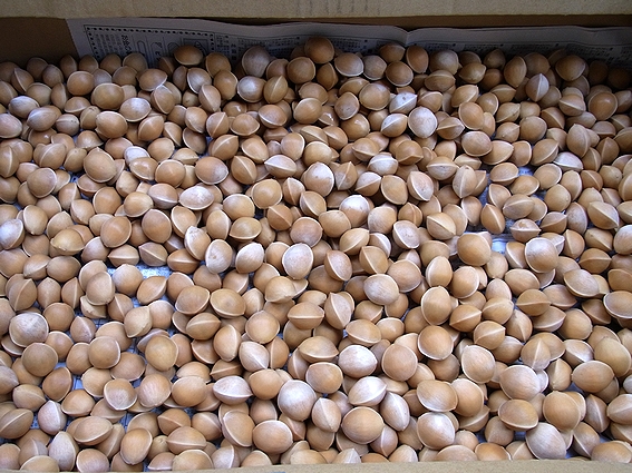 銀杏はまず金槌で鬼殻を割り、そのまた中の薄皮を剥いて最後に半分に切ります。