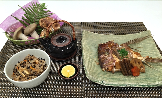 今日の献立は鹿尾菜ご飯、真鯛の兜煮、土瓶蒸しの三品です。
