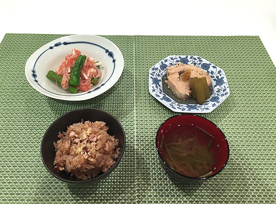 献立は、蛸飯・新牛蒡汁・生節と蕗の煮物・白滝の明太子和え・・でした。