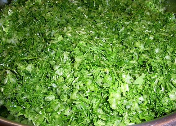 葉の方は小口から細く刻み、サッと湯通しして、ギュッと絞ります。