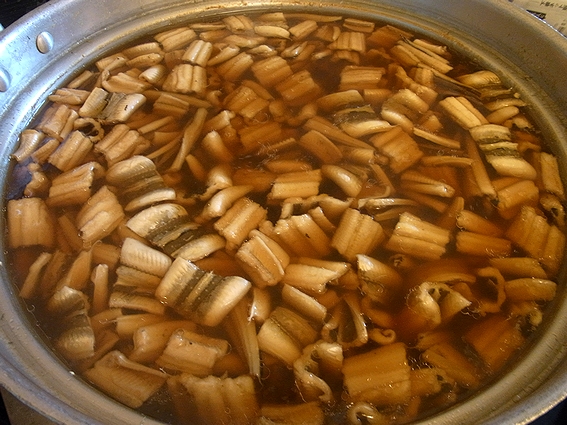 更に流水で洗い、食べやすい大きさに切り煮付けます。