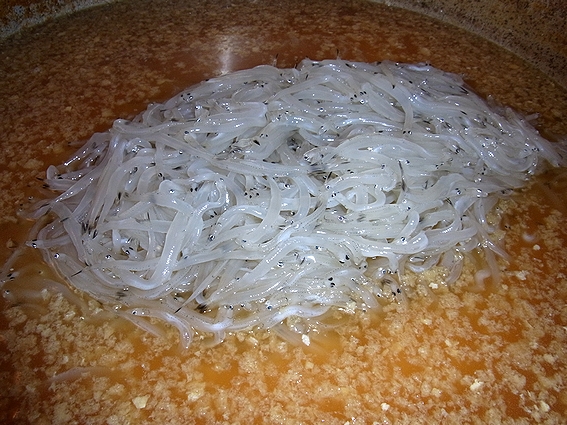 白魚を塩水で洗い、黄金出汁で炊飯します。