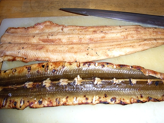 業者さんが裂いて炭焼きにしたものですが、今回は一度煮て煮アナにします。