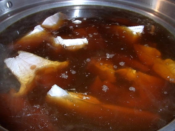 サッと煮て、身をほぐし、煮汁のまま炊飯します。