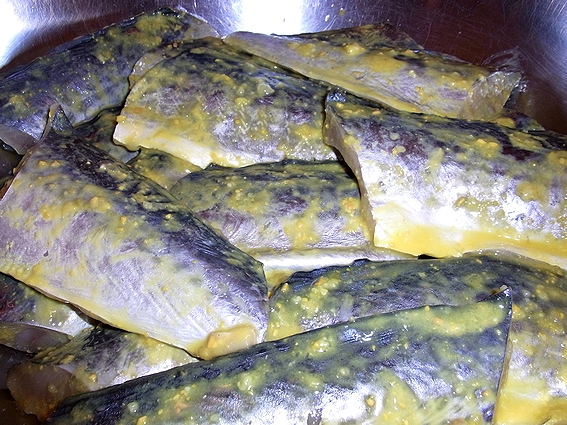 関西のお正月には欠かせない狭腰(サゴシ)は、サワラの幼魚で、酢で締めたキズシにします。