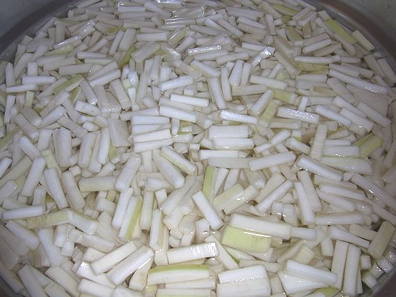 サッとボイルして輪切りにし、濃い目のお出汁に生姜をきかせて炊飯します。